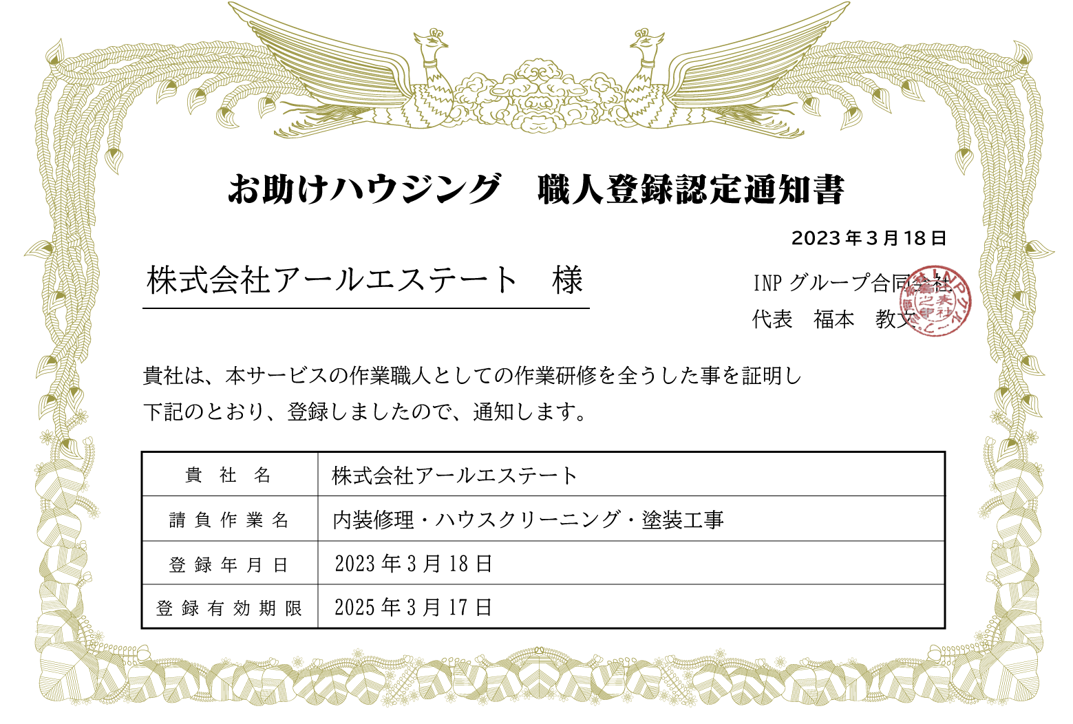 審査を通過した職人(施工業者)様は、弊社独自の研修を5日間行い、研修満了時に職人登録認定通知書を発行しております。