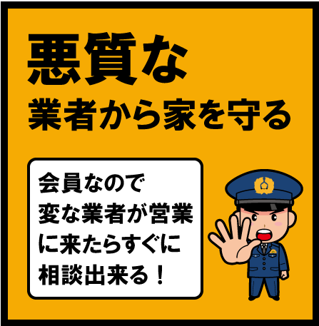 会員になる事で、住宅に関わる事をいつでも相談でき、訪問販売業者や点検商法といった、悪徳リフォーム業者からあなたを守る仕組みとなっております。